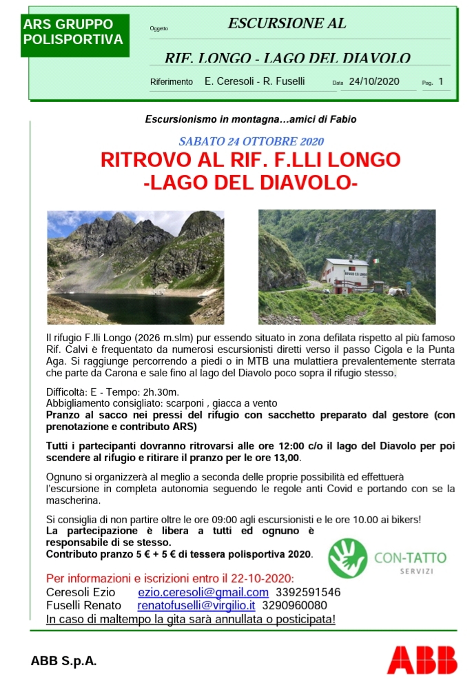 Sabato 24 ottobre ci si ritrova al Lago del Diavolo per poi pranzare al sacco nei pressi del rif. Longo. Il pranzo al sacco verrà preparato direttamente dai gestori del rifugio.