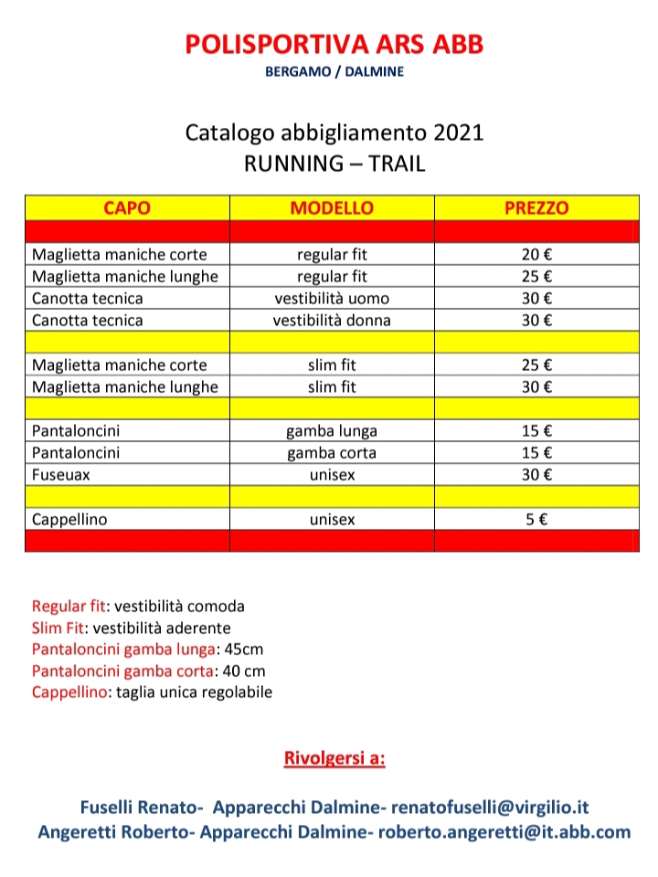 Dal 15 giugno al 2 luglio, la Polisportiva Ars ABB raccoglie per l'anno 2021 ordinativi riguardanti la propria linea di abbigliamento Running - Trail. Dopo il successo della prima vendita "sperimentale" e su suggerimento dei dipendenti abbiamo deciso di inserire delle novità come le Canotte super tecniche con vestibilità differenziata per donna, i Fuseaux per coloro che non amano i pantaloncini, i cappellini, le magliette maniche corte slim fit e i pantaloncini con gamba corta! Malgrado i ritardi causa Covid quest' estate ci aspettano ancora tante corse e camminate in montagna con le nostre magliette ABB !!! Rivolgersi a: renatofuselli@virgilio.it roberto.angeretti@it.abb.com