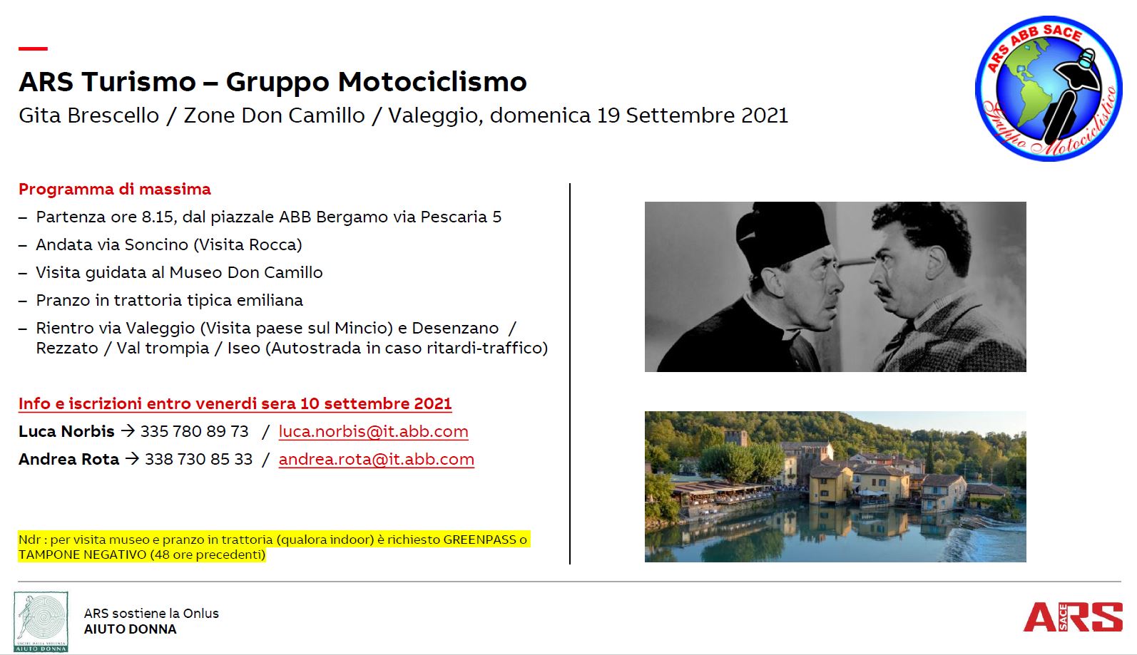 Programma di massima: Partenza ore 8.15, dal piazzale ABB Bergamo via Pescaria 5. Andata via Soncino (Visita Rocca). Visita guidata al Museo Don Camillo. Pranzo in trattoria tipica emiliana. Rientro via Valeggio (Visita paese sul Mincio) e Desenzano / Rezzato / Val trompia / Iseo (Autostrada in caso ritardi-traffico). NOTA IMPORTANTE: per visita museo e pranzo in trattoria (qualora indoor) è richiesto GREENPASS o TAMPONE NEGATIVO (48 ore precedenti). Info e iscrizioni entro venerdi sera 10 settembre 2021: Luca Norbis (335 780 89 73 / luca.norbis@it.abb.com ) o Andrea Rota (338 730 85 33 / andrea.rota@it.abb.com).