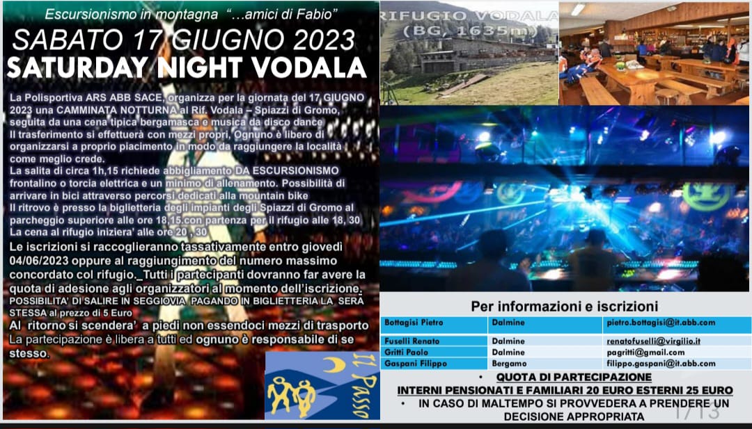 La Polisportiva ARS ABB SACE organizza per la giornata del 17 giugno 2023 una camminata notturna al rif. Vodala - Spiazzi di GromoTutte le info nella locandina allegata